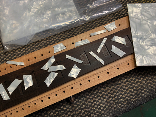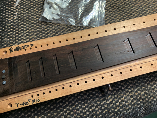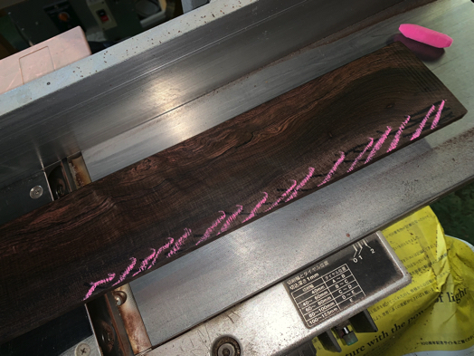 レスポールタイプ製作 · 11日 12月 2019 レスポールタイプ製作 9 指板インレイ入れ 指板底面をプレーナーで平面出しする。 今回の指板材は木目が素直でない部分があったので、プレーナーの掛かりを浅くした。 プレーナーは危険なので、材を直接、手で送ることはしない。 加減しながら、材の反りも修正する。 専用の加工台に指板材を載せて、インレイ穴をNC加工する。 加工が終了した画像。 インレイもNCで切り出したものを使う。 インレイとインレイ穴は、僅かにクリアランスを設けているので、調整する事なく綺麗に収まる。 黒のエポキシ系接着剤で固める。 少し、盛りすぎかも。 1晩、放置する。 <前へ 次へ> tagPlaceholderカテゴリ: