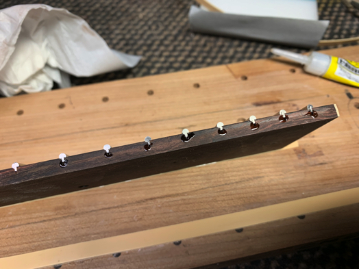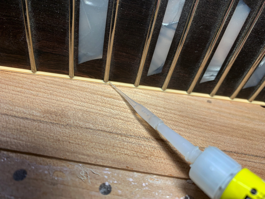 フレットタンとフレット溝の隙間にも、念のため接着剤を流し込む。