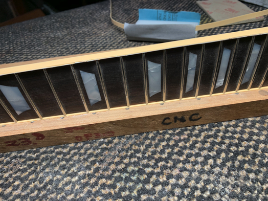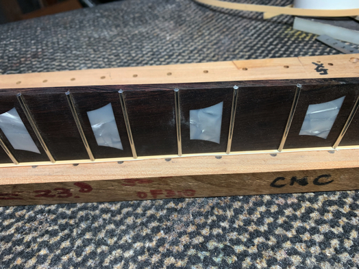 まず、指板エンド部にバインディングを接着。