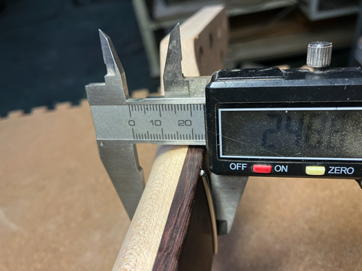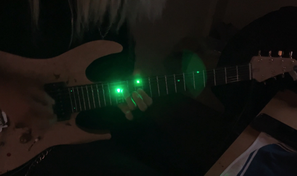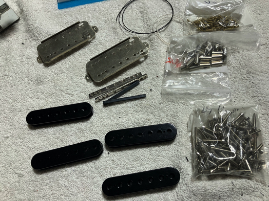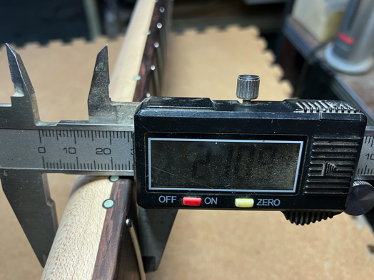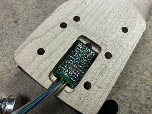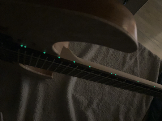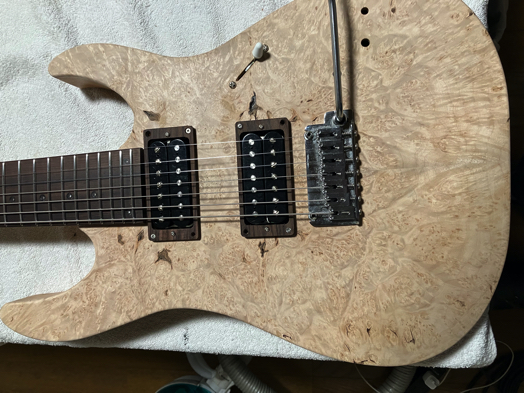 バールメイプルトップギター製作 · 22日 12月 2022 バールメイプルトップギター製作18 仮組み・音出しチェック 木工が全て終了したので、塗装前にパーツ類を搭載し、音出しチェックする。 ピックアップは、YOSHIKI氏と打ち合わせし、 数個のプロトタイプを製作した結果、 エナメルワイヤとアルニコ2 マグネットを使用することに。 ネック厚は、1F・25mm、12F・27mm。 ネックエンド部のソケットにLED基盤からの配線を接続。 ブリッジは最終的にはゴールドパーツに交換予定。 サイドのポジションマークはグリーン。 YOSHIKI氏に来訪してもらい、試奏。 LEDギミックも無事に動作。 幾つかの改善点が見つかったため、塗装前に修正する必要がある。 <前へ 次へ> tagPlaceholderカテゴリ: